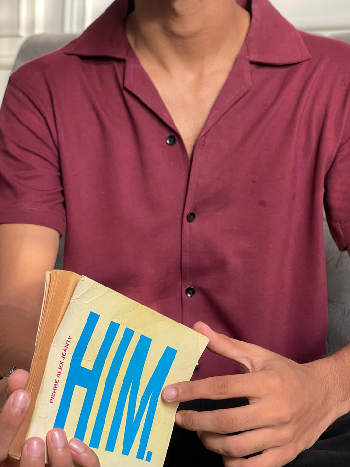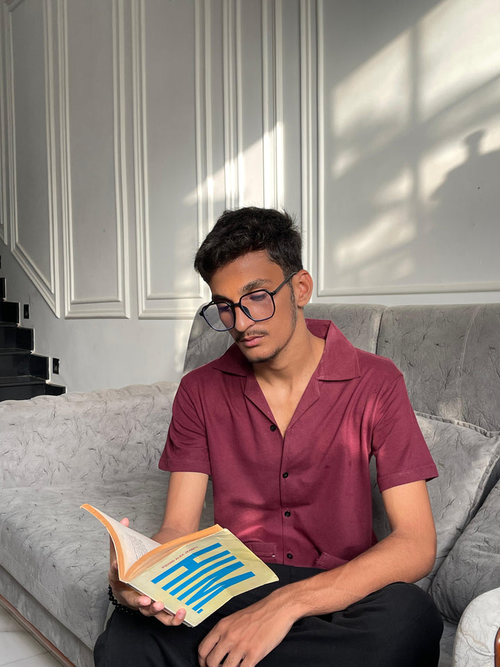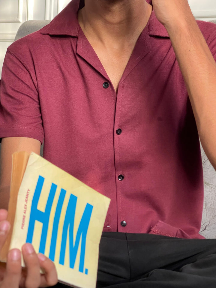 A stylish maroon short-sleeve shirt with a relaxed camp collar and lightweight fabric, perfect for casual outings or semi-formal occasions