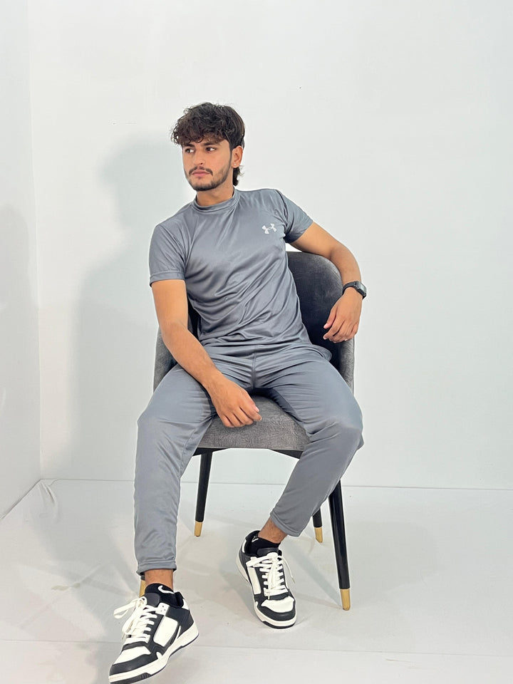 Lightweight and breathable gray athletic t-shirt made from moisture-wicking fabric, perfect for workouts or everyday comfort.