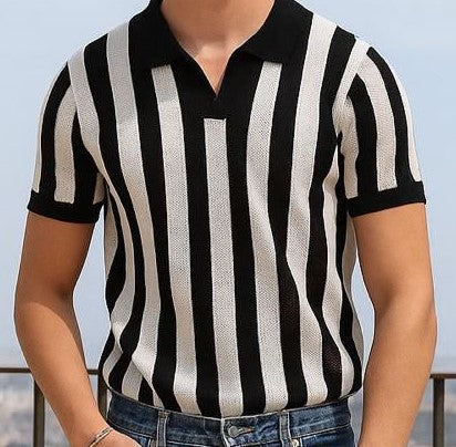 This shirt is an Old Premium Polo designed in a distinctive crochet style, blending vintage charm with modern comfort. Featuring an original polo collar design and a sleek two-button placket, it exudes timeless elegance. The shirt showcases classy black and white vertical stripes, offering a bold yet sophisticated look suitable for both casual and semi-formal settings. Crafted from the most breathable fabric, it ensures maximum comfort, especially in warm weather. Additionally, the material is wrinkle-resistant, making it ideal for everyday wear without the hassle of constant ironing. This polo shirt is a perfect combination of style, comfort, and practicality, ideal for the modern man who appreciates classic aesthetics with contemporary functionality.