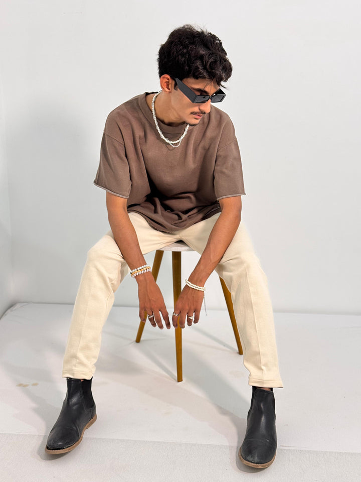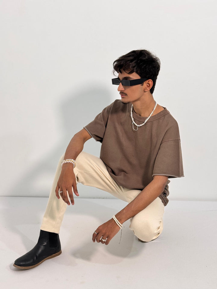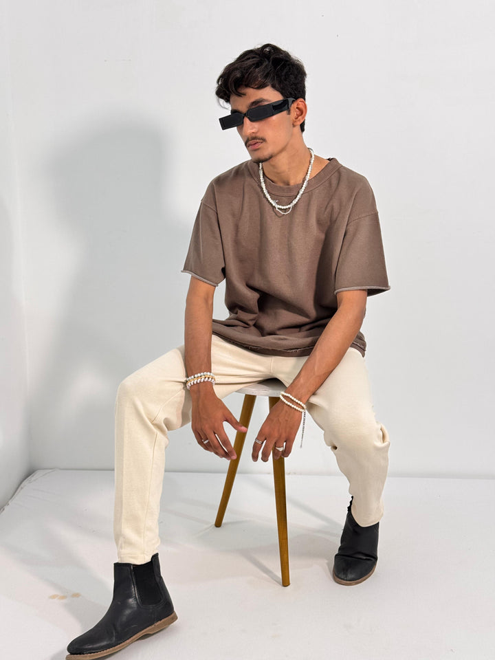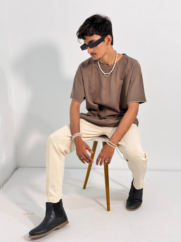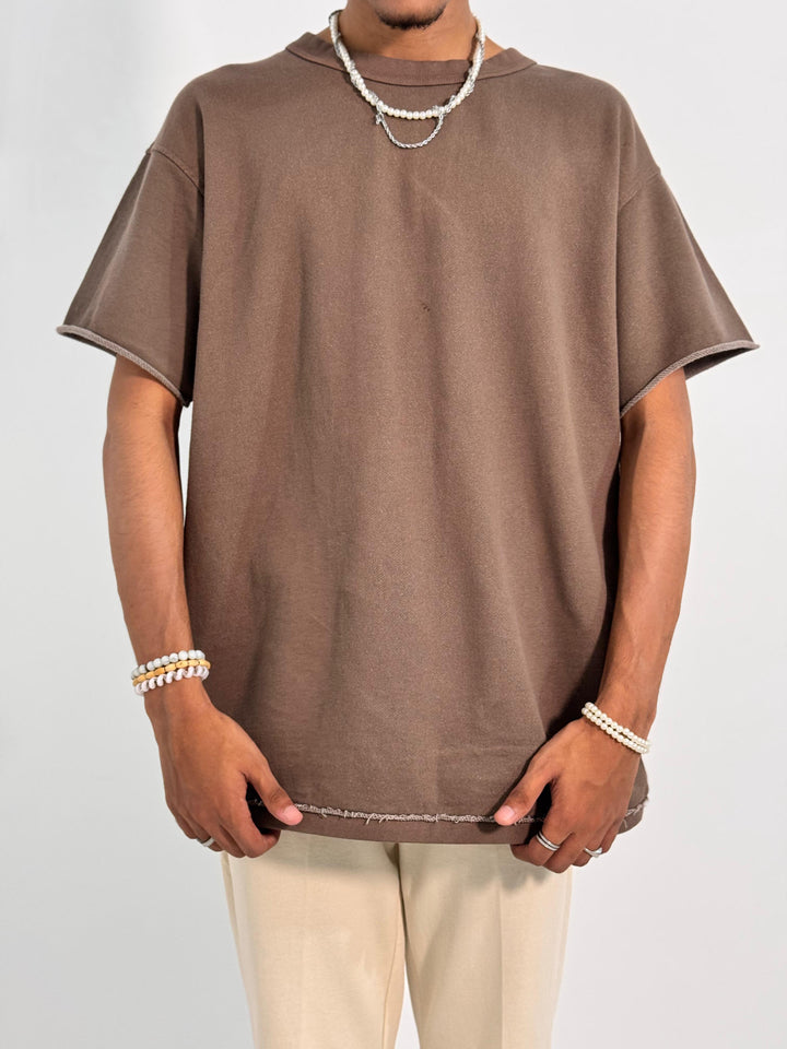 Designed for pure comfort, this oversized brown tee is made from a premium, soft-touch fabric that drapes beautifully. The relaxed fit provides an easygoing silhouette, while the raw edges add a contemporary touch to your everyday style.